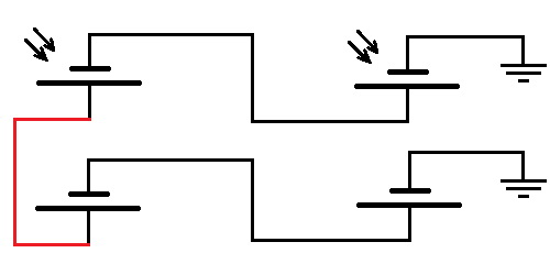 Солнечные батарейки так же как и аккумуляторы были подключены последовательно (черные линии на схеме). Для нормальной работы необходимо провод оставшийся от одной солнечной батарейки (на схеме и фото выделен красным) подключить к положительной клемме держателя. Без такого подключения модуль-хамелеон не запускается.