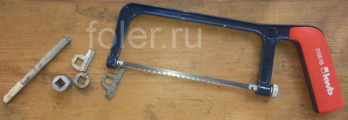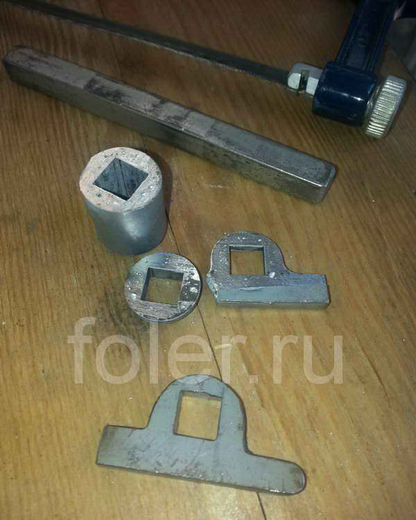 Можно сначала "болгаркой", потом напильником, но деталь небольшая и безопасней просто ножовкой. Не забываем про отверстие под квадрат.